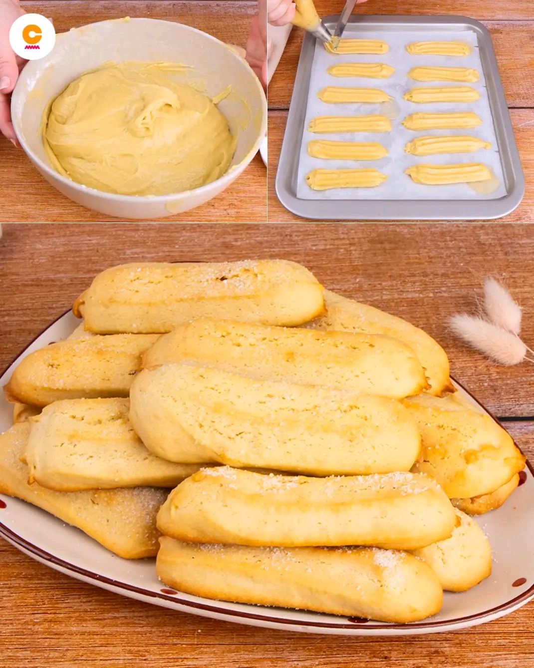 Riempi un sac à poche con il composto e spremi l’impasto su una teglia, rivestita con carta forno, per formare biscotti lunghi circa 10 cm 5.