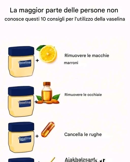 Dimentica i balsami labbra che spariscono dopo un’ora! Una goccia di vaselina è sufficiente per proteggere e ammorbidire le labbra, anche con il freddo. Aggiungi un po’ di miele o olio essenziale di menta piperita per un trattamento delicato e rinvigorente.